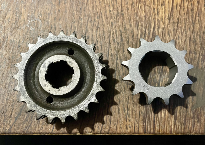 Now to the gearing situation...as I have said I was going to fit one of Pete Kirby's clutches with the ten plates he suggested...But Pete is unable to work a lot with a bad back, and other problems. So with what he said about the power issue with a 18 tooth engine sprocket, I am going to use a 23 tooth B25 sprocket and try and use a 13 tooth gearbox sprocket and probably up to 65 teeth on the rear wheel sprocket, and see how we go.