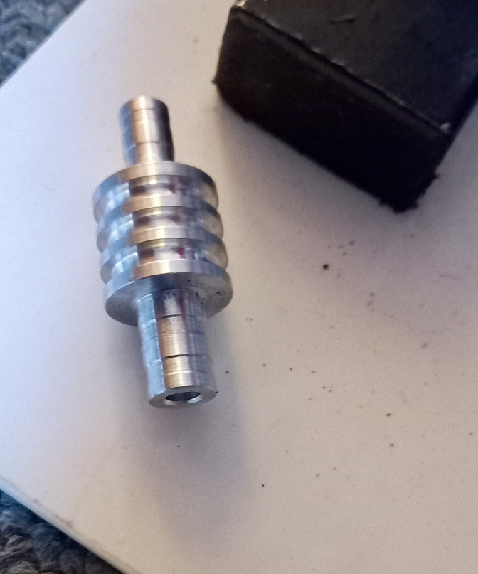 For instance, the pipe fittings on the filter are 10mm...3/8" but the oil lines are 8mm... 5/16". I machined up some adaptors to suit, I could have made them straight, but an extra ten minutes on the lathe and you have a more aesthetic looking piece. I tell people it help to cool the oil. (BS)...